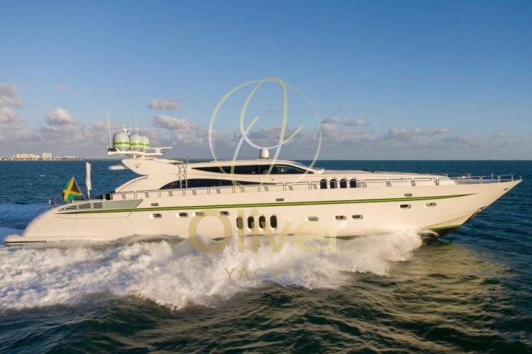 Très bon état généralJet d’eau KaMeWaLes reprises sont évaluéesPont principalHall d’entrée avec coin salon, avec canapé en L à gauche, canapé avec tables pliantes à tribord | Bar d’angle central derrière la timonerie avec toit panoramique | Salle home cinéma à l’avant avec TV 3D 60" qui se transforme en une 5ème cabine double avec canapé-lits et salle de bainPont inférieurSuite propriétaire au milieu du navire, lit king size, coin salon, télévision grand écran et salle de bain attenante | Cabine VIP à l’avant avec lit king size, coin salon, télévision grand écran et salle de bain attenante | Cabine invités avec lit double, télévision grand écran et salle de bain privée à tribord, entre la cabine VIP et la cabine principale | Cabine d’invités avec lits plats, autocar en option, télévision grand écran et salle de bain privée sur la gauche | Cabine équipage avec lits plats et salle de bain privée avec entrée indépendante depuis le coqueron avant | Cabine du capitaine avec lit simple, cabine de l’équipage avec lits superposés, cuisine et buanderie au milieu du navire et salle des machines à l’arrièreDevant l’entrée du salon principal, il y a des canapés d’angle des deux côtés avec deux tables et un canapé qui rejoint une grande terrasse le long de la poupe. Un escalier de chaque côté mène à la plate-forme de bain sur le pont inférieur. Des passerelles latérales mènent le long du pont principal jusqu’au pont avant, où se trouve un autre canapé en forme de C avec deux tables et de grandes chaises longuesSystème AV Crestron | Système stéréo surround B&OTV 42" dans le salon de pont | TV dans chaque cabine Home Cinéma avec écran 3D 60"iPod dans le salon de pont, la salle de télévision, la cabine principale et la cabine VIPFEUILLE EN COURS DE MISE À JOUREquipement électronique de navigation:AIS, Indicateur d'angle de barre, Antenne radar, Commande électrique, Ordinateur fixe de bord, Compteur de chaîne, Moniteur, DSC VHF, Plotter GPS, Siège copilote.Equipement de pont:Alarme gaz, Alarme moteur, Alarme de pompe de cale, Eau sous pression, Trim hydraulique, Passavant en teck, Douche de cockpit, Phare de poursuite, Flaps hydrauliques, Garage à annexe, Grue pour jet-ski, Bossoirs pour annexe, Hard top, Extincteur(s) fixe(s), Indicateurs de flaps, Lavabo dans le cockpit, Éclairage de courtoisie, Jet-ski (Seadoo 155 Hp), Passerelle (idraulica), Plateforme arrière, Pompe de cale automatique, Pont en teck, Porte latérale, 2 Porte latérale, Cockpit en teck, Prise de quai, Connexion eau sous pression à quai, Guindeau électrique, Echelle de bain, table de cockpit, Table pliante de salon, Annexe, Corne, 2 Winch électrique arrière.Equipement intérieur:Ballon d'eau chaude, Air Conditionné, Connexion à internet, Contrôleur domotique, Gradateur de lumière, Dessalinisateur, Cuve à eaux noires, Plancher intérieur en bois, Prises interieures 12v, Prises interieures 220v, Réservoir d'eau noire, 8 Toilettes électriques.Divers:Haut-parleurs, Home cinéma (Home Cinema with 60" 3D Screen), Radio AM/FM, Hi-Fi (B&O surround sound stereo system), 6 TV (salone, home cinema e nelle cabine).Equipement de confort:Cuisine, Réfrigérateur extérieur, Machine à glaçons, Lave et sèche-linge, Lave-vaisselle, Machine a café, Plaque vitrocéramique, Winecooler.Sellerie et tauds:Sellerie complète, Coussins arrieres, Coussin avant, sellerie de cockpit, Tauds de pare-brise.